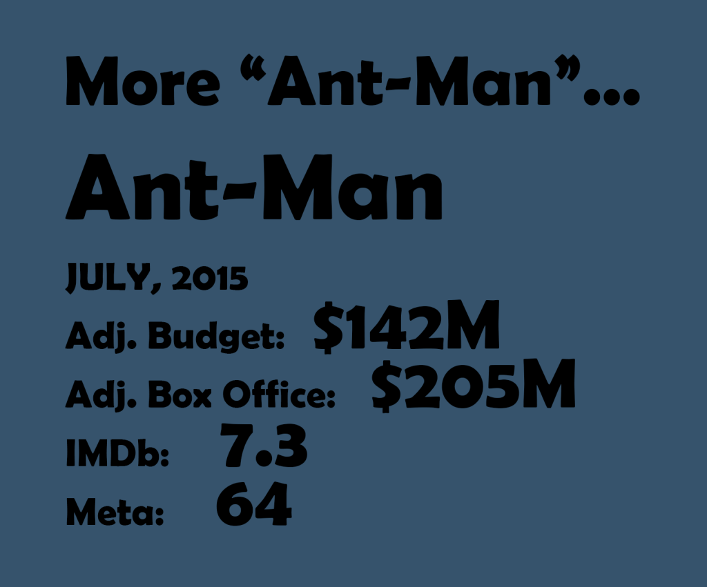 Ant-Man and the Wasp is one of the most purely enjoyable MCU films, with its breezy action, high joke count, and quirky mad scientist vibes. Both Ant-Man films have benefited from their relatively smaller stakes which offer counter programming to the proper Avengers films which only seem to get bigger and bigger with each new entry. Though the story dovetails with the grander narrative, Wasp stakes out just enough ground to be an enjoyable standalone. That proper balance of elements, plus an eclectic cast make for a thoroughly appealing action comedy. Both Ant-Man movies scored well in this exercise, and were solid box office hits, so feel free to consider either as the true holder of this spot on the countdown.