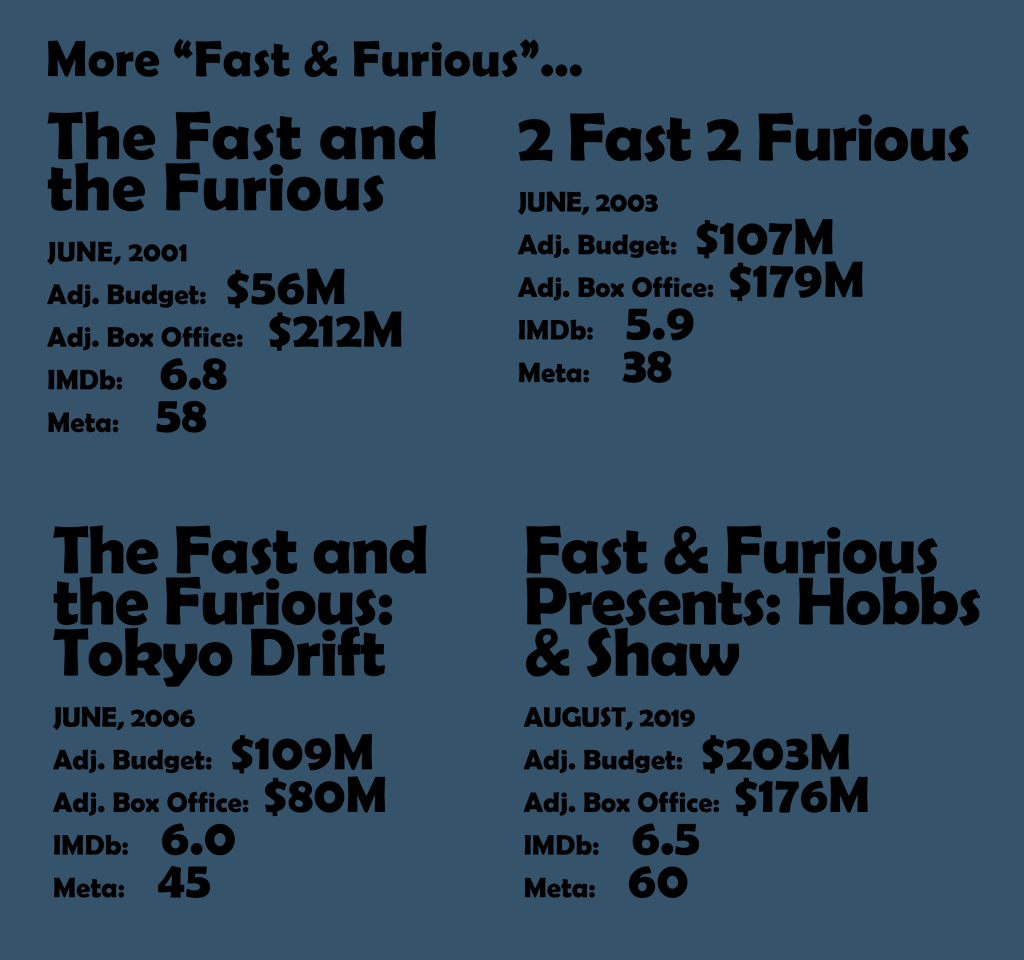 If you can only differentiate the Fast films by their most outlandish setpieces, then Fast & Furious 6 is either the one where Dom and Letty leap from separate vehicles and over the gap between two elevated highways into each other’s arms — OR — the one where Dom drives a car out of the nose cone of an exploding cargo plane. Also, Luke Evans is in it. This Justin Lin-directed sequel is insane, and also good, and also a loud and clear indication that Fast was/is fully committed to its new identity as a maximalist mashup of James Bond and The Avengers and every action movie in-between. That’s not going to be everyone’s cup of tea (or Corona… or Red Bull), but Fast & Furious 6 finds balance with a diverse and accomplished cast that’s up for anything. In line with most of the recent Fast installments, critics and general audiences have rewarded FF6 for its moxie. The Fast and the Furious is a summer movie franchise if there ever was such a thing, however, some of the fan-favorites including Fast 5 and Furious 7 were April releases and therefore ineligible for this exercise.