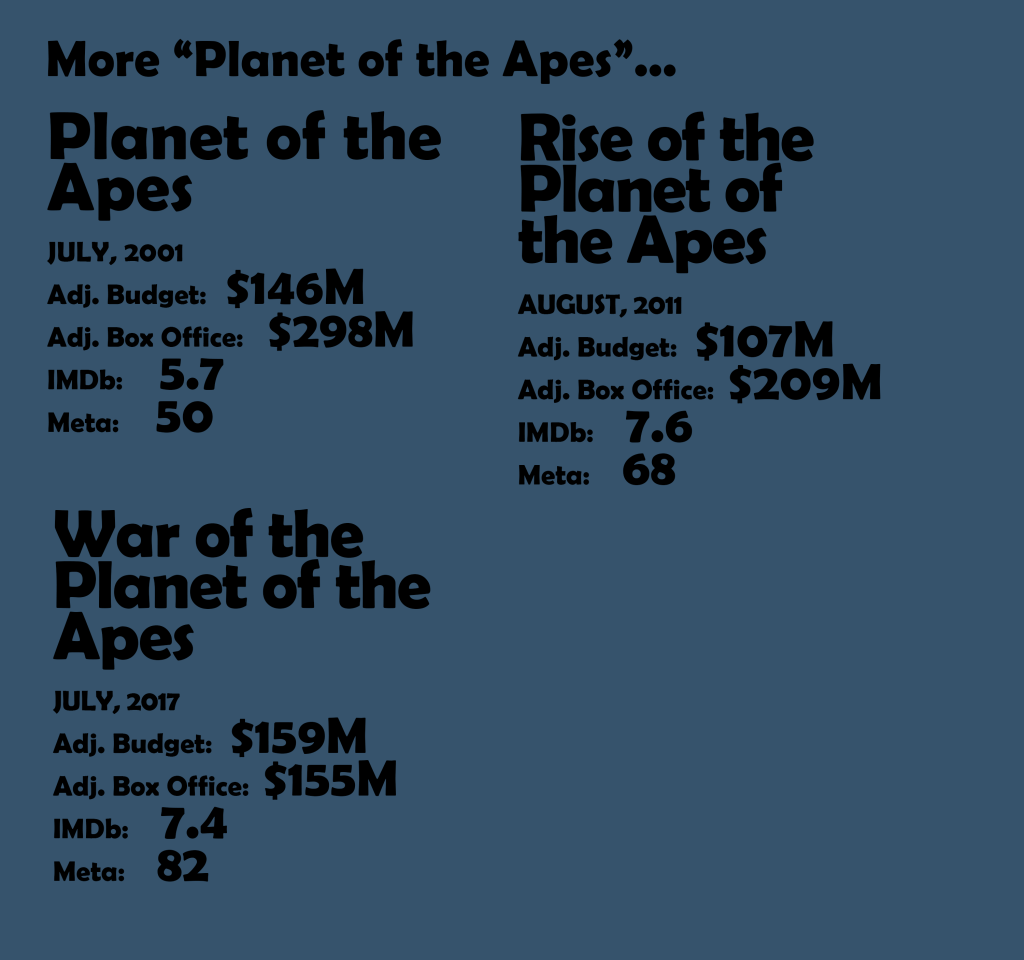 You could make a case that the newer Planet of the Apes movies beat 2019’s The Lion King to the punch in the photorealistic animated animal department. While it’s a bit strange that this series is essentially a re-imagining of the original series’ lesser sequels, there’s no denying that the films have been entertaining and more provocative than your usual big-budget summer fare. All three Apes films since 2011 have been big summer successes, and each was lauded by critics. It will be interesting to see where this story can go with Disney now in control of the franchise. Apes is such a proven commodity, that even the much-maligned Tim Burton-Mark Wahlberg version was a sturdy hit. All of these movies qualified, but Dawn gets to represent the series in this spot on the countdown.