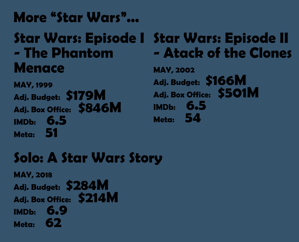 Is Revenge of the Sith the best Star Wars prequel film? Many would say “yes,” and the reviews certainly back that up. Regardless, Sith, Attack of the Clones, and The Phantom Menace all feel of a piece with one another and they were all May releases to boot. Sith arrived with massive anticipation as the capstone on the Anakin Skywalker story and it does serve to fill in the gap between the earlier prequels and the more revered Original Trilogy. To its credit, Sith operatically nails all of the emotional beats needed to complete the story. The film has its deficiencies, but there’s plenty in Episode III for the Star Wars faithful to enjoy. It may be a small surprise that the only other Star Wars movie released over the summer was Solo in 2018. All four summer Star Wars scored similarly by our metrics so feel free to pick your favorite to represent the franchise in this spot.